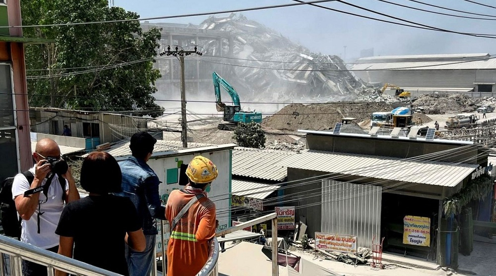 मध्य म्यानमारमा शुक्रबार गएको शक्तिशाली भूकम्पपछि थाइल्यान्डको बैंककमा भत्किएको भवन स्थल हेर्दै मानिसहरू । एन वाङ/रोयटर्स