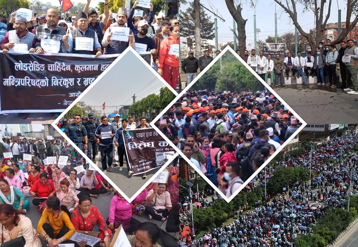 कतै सहकारीमा जम्मा गरेको पैसा फिर्ता नपाएको पीडितको चीत्कार, कतै विद्युत प्राधिकरणका कार्यकारी निर्देशक कुलमान घिसिङको बर्खास्तीप्रति असन्तुष्टि। कतै शिक्षकको ऐन जारी गर्नुपर्ने माग, कतै निजी मेडिकल कलेजका चिकित्सकहरूको निर्वाह भत्ताको आवाज।