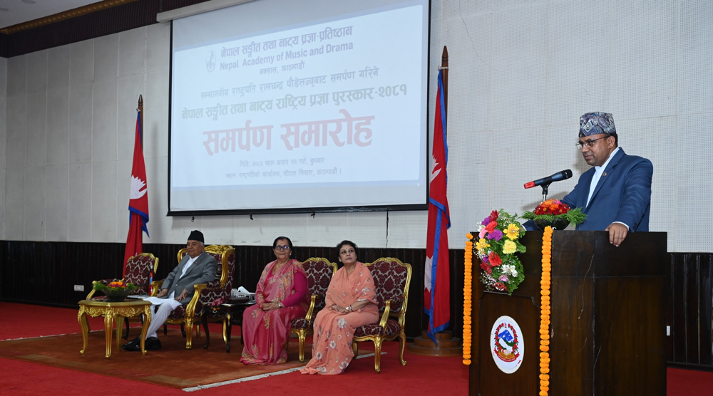 राष्ट्रपति भवन शीतलनिवासमा बुधबार आयोजित नेपाल संगीत तथा नाट्य राष्ट्रिय प्रज्ञा पुरस्कार २०८१ को अवसरमा आयोजित एक विशेष समारोहमा उनले यस्तो धारणा राखेका हुन् । नौजना स्रष्टालाई राष्ट्रिय सम्मान प्रदान गर्दै उनले भने, ‘यहाँहरूको साधनाले नै नेपालको साहित्यिक र सांस्कृतिक यात्रा बाँचेको छ। अब हामीले विदेशी भाषाका गीत सुन्ने बाध्यता हटाएर आफ्ना शब्द, स्वर र सङ्गीतको त्रिवेणीलाई विश्वभर गुञ्जयमान बनाएका छौं ।’ उनले लामो साधना र निरन्तर अभ्यासबाट खारिएका स्रष्टाहरूबाटै राष्ट्रको सांस्कृतिक धरोहरको संरक्षण, पुस्तान्तरण र प्रवर्द्धन सम्भव हुने विश्वास व्यक्त गरे । ‘हाम्रो अभौतिक संरचना हस्तान्तरण गर्नुपर्ने सन्देश यस कार्यक्रममा प्रस्ट रूपमा आएको छ,’ उनले भने ।