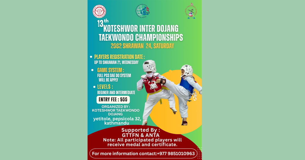 कोटेश्वर तेक्वान्दो डोजाङको आयोजनामा १३औं कोटेश्वर अन्तर डोजाङ तेक्वान्दो प्रतियोगिता भोलि (शनिबार) हुने भएको छ ।