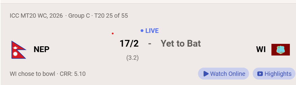 आईसीसी पुरुष टी–२० विश्वकप क्रिकेट, २०२६ अन्तर्गत वेस्टइन्डिजविरुद्धको खेलमा नेपालले पहिले ब्याटिङ सुरु गरेको छ ।