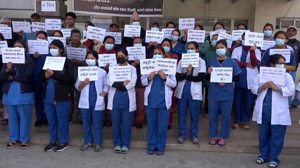 अस्पताल स्थापनाकालदेखि दैनिक ज्यालादारी कर्मचारीको सेवा-सुविधा एवं अन्य सेवा सुविधा बढाउन माग गर्दै आन्दोलनमा उत्रिएको राष्ट्रिय स्वास्थ्यकर्मी श्रमिक संगठनका केन्द्रीय अध्यक्ष केशव रोकायाले बताए । स्वास्थ्य क्षेत्रको काम सम्मानजनक भएको उल्लेख गर्दै उनले सम्मानजनक सेवा-सुविधा दिनुपर्ने बताए ।