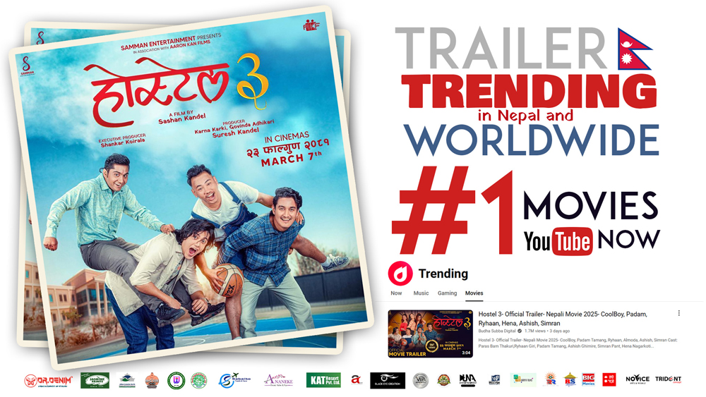 नेपाली चलचित्र ‘होस्टेल ३’ को गत शुक्रबार सार्वजनिक भएको ट्रेलरले व्यापक हाइप प्राप्त गरेको छ । रिलिजको ६ घण्टामै युट्युबको ट्रेन्डिङ यात्रा सुरु गरेको ट्रेलरले २१ घण्टामै १० लाख भ्युज प्राप्त गरेको थियो । नेपालमा फिल्म सेक्सनमा पहिलो स्थानमा र करिब १५ वटा देशमा ट्रेन्डिङमा आएको थियो, जुन अहिलेसम्म पनि कायमै छ ।