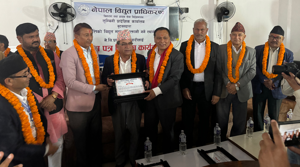 प्राधिकरणकातर्फबाट कार्यकारी निर्देशक कुलमान घिसिङले बुटवलमा गरिएको कार्यक्रममा सडक बत्तीको बक्यौता तिर्ने ५ गाउँपालिका र ८ नगरपालिका गरी १३ पालिकाका प्रमुखहरुहरुलाई सम्मानसहित प्रशंसापत्र वितरण गरे ।
