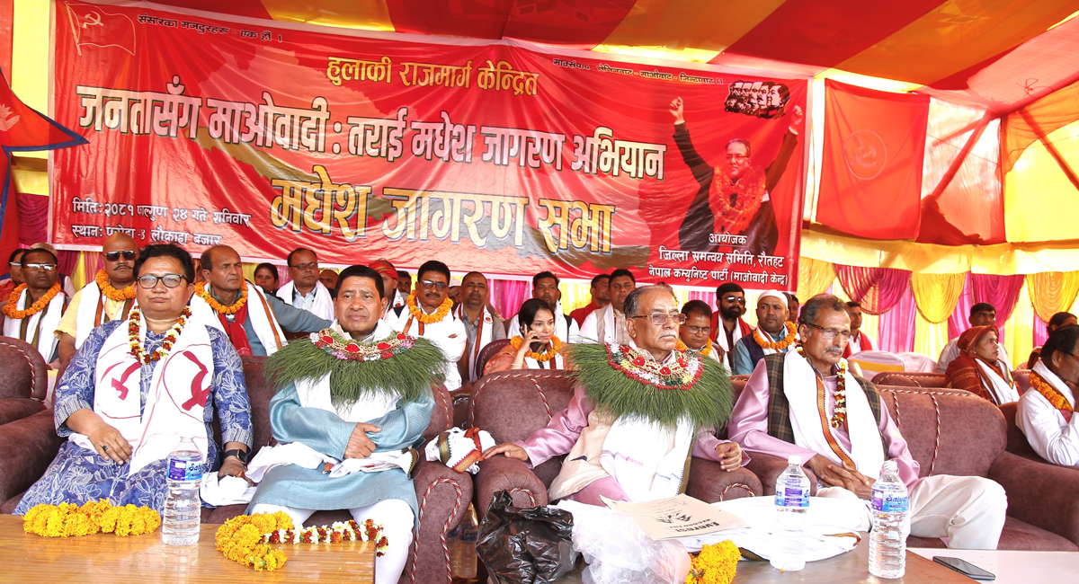 माओवादी अध्यक्ष पुष्पकमल दाहाल, वरिष्ठ उपाध्यक्ष नारायणकाजी श्रेष्ठलगायत शीर्ष नेतृत्व टोली अनियानअन्तर्गत शनिबार रौतहटमा आयोजित कार्यक्रममा सहभागी छन् ।