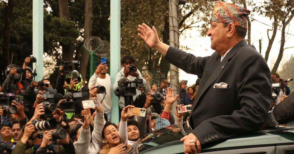 पूर्वराजालाई राप्रपा र अन्य राजसंस्थासम्बद्ध दलहरूले र्याली, झाँकी र बाजागाजासहित विमानस्थलबाट निर्मल निवाससम्म पुर्याउँदै छन्। विमानस्थल परिसरमा पूर्वराजाका समर्थकहरूको ठुलो भिड जम्मा भएको थियो। राप्रपा र अन्य दलका नेताहरूको उपस्थिति विमानस्थलमा विशेष थियो।