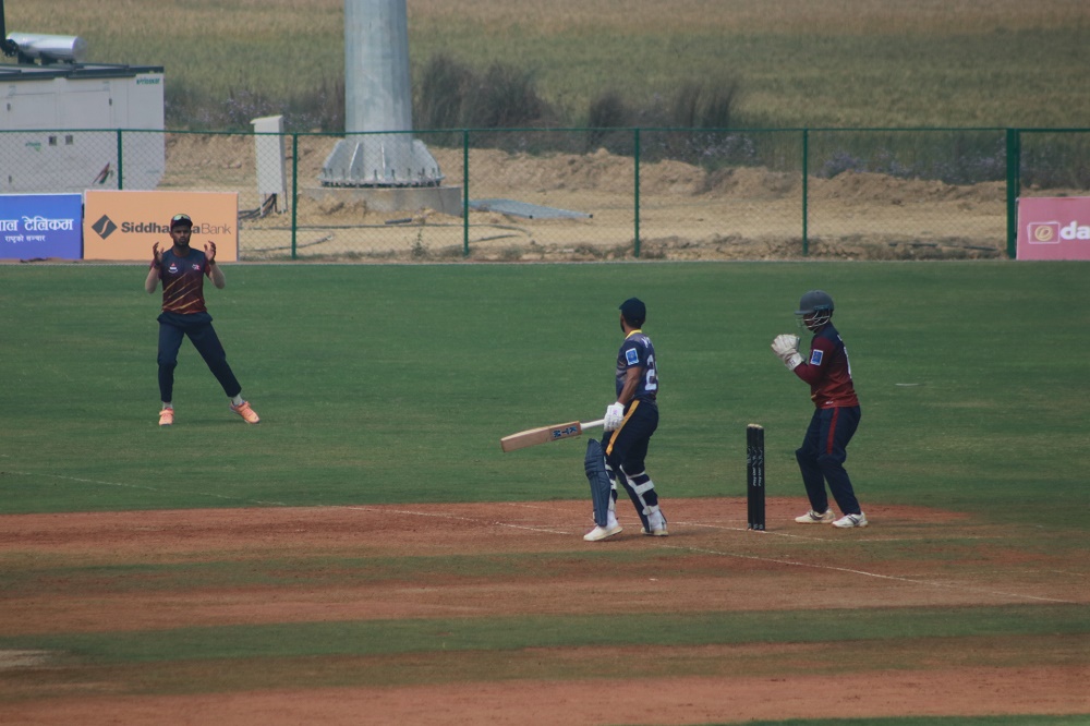 यस्तै मृनाल गुरुङले ३० तथा सलाहुद्दिन खानले १३ रन बनाए । बलिङतर्फ पुलिस क्लबका करण केसीले तीन तथा ललितनारायण राजवंशी र दीपेन्द्रसिंह ऐरीले दुई दुई विकेट लिए ।