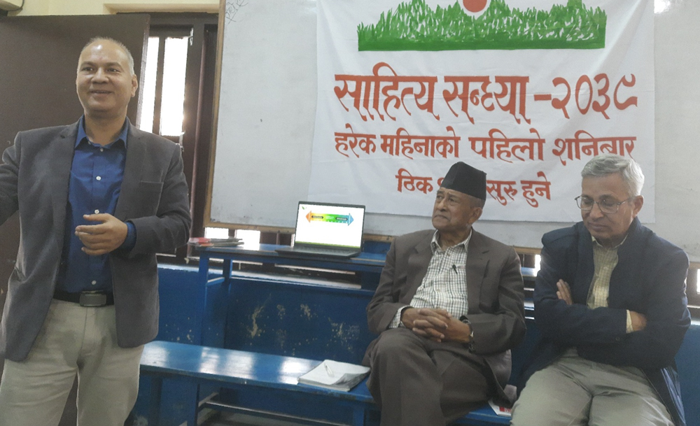 सभाध्यक्ष राम विनयले साहित्य सन्ध्या भनेको एक प्रकारको कार्यशाला हो । बगिरहेको पानी एकै स्थानमा जमिरह्यो र गतिशील हुनपाएन भने अर्थात् चलायमान भएन भने दूषित हुन्छ, त्यही कुरा मानिसको जीवन र सोचाइमा पनि लागू हुन्छ । यसलाई नियमितरूपमा धोईपखाली गरिरहनुपर्ने हुन्छ । जीवन नदी हो, कहिले बाढीले धमिलो हुन्छ, कहिले यो निर्मल हुन्छ । निरन्तर बगिरहेको जीवननदीलाई स्वच्छ पार्न यस प्रकारको वैचारिक विमर्श चाहिन्छ । त्यसैले साहित्य सन्ध्याले नियमितरूपमा परिचर्चा कार्यक्रम चलाइरहेको हो