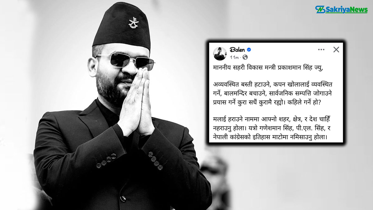 ‘माननीय सहरी विकासमन्त्री प्रकाशमान सिंहज्यू, अव्यवस्थित बस्ती हटाउने, कपन खोलालाई व्यवस्थित गर्ने, बालमन्दिर बचाउने, सार्वजनिक सम्पत्ति जोगाउने प्रयास गर्ने कुरा सधैं कुरामै रह्यो,’ मेयर शाहले फेसबुकमा लेखेका छन्, ‘कहिले गर्ने हो ? मलाई हराउने नाममा आफ्नो सहर, क्षेत्र र देशचाहिँ नहराउनुहोला । यत्रो गणेशमान सिंह, पीएल सिंह र नेपाली कांग्रेसको इतिहास माटोमा नमिसाउनु होला ।’