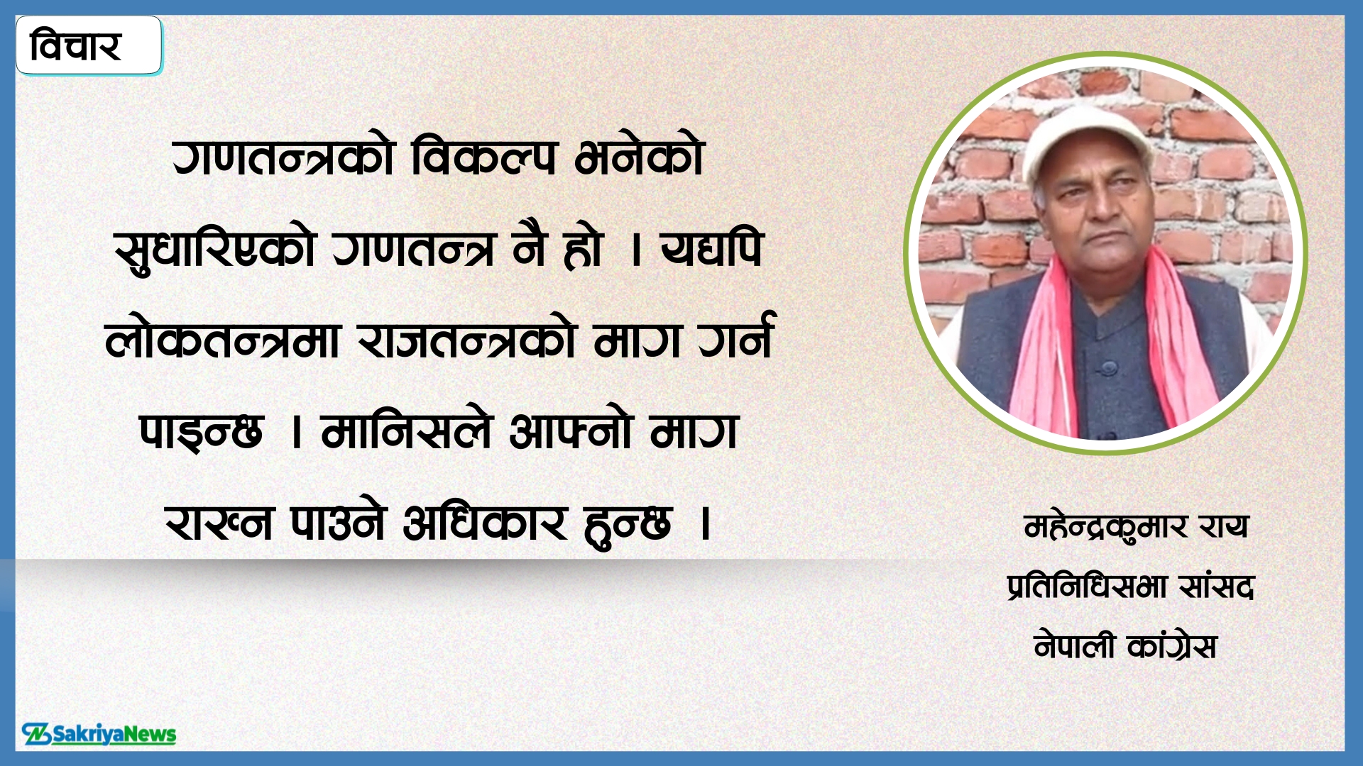 मानिसले आफ्नो माग राख्न पाउने अधिकार हुन्छ । तर अब यही संघीय लोकतान्त्रिक गणतन्त्रलाई बलियो बनाउनुपर्छ । गणतन्त्र बलियो बनाउन राजनीतिक दलको मुख्य भूमिका हुन्छ । दलहरूबीच एकता नभएका कारण पनि राजतन्त्रवादीहरू सलबलाउने मौका पाएका छन् । अब जनताको अवस्था अझै सुधार गर्न दलहरूबीच एकताको आवश्यकता छ । दुई/चारजनाले संसद् वा सडकमा उफ्रिएर केही हुँदैन । मेरो पक्षमा जनता छैनन् भन्ने कुरा पूर्वराजाले बझ्नुपर्छ ।