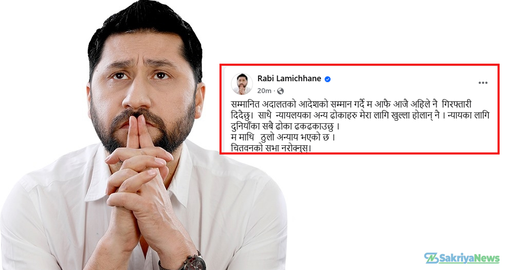 ‘सम्मानित अदालतको आदेशको सम्मान गर्दै म आफैं आजै अहिले नै गिरफ्तारी दिँदै छु,’ लामिछानेले फेसबुकमार्फत भनेका छन्, ‘साथै न्यायलयका अन्य ढोकाहरू मेरा लागि खुला होलान् नै । न्यायका लागि दुनियाँका सबै ढोका ढकढकाउँछु ।’