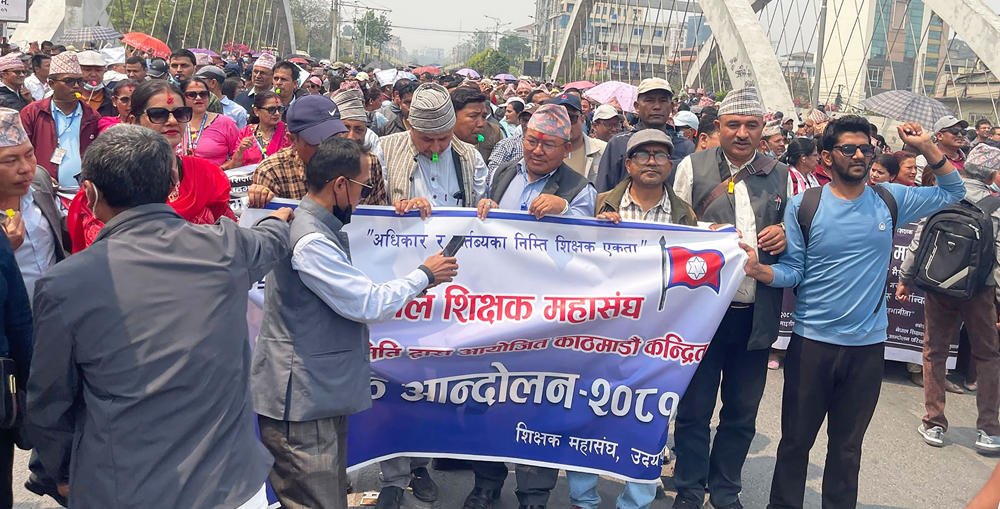 नेपाल शिक्षक महासंघले विभिन्न माग राख्दै सुरु गरेको आन्दोलन आज (आइतबार) पनि जारी छ । आज शिक्षकहरु बबरमहल-बानेश्वर सडकमा भेला भएर सिठ्ठी बजाउँदै, गीत गाउँदै आफ्ना मागप्रति सरकारको ध्यानाकर्षण गराइरहेका छन् ।