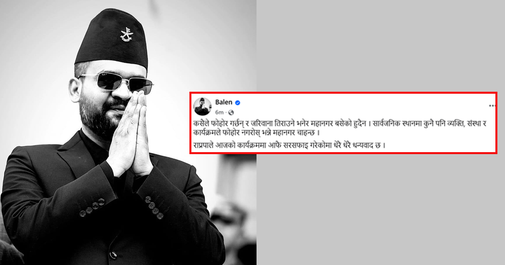 ‘कसैले फोहोर गर्छन् र जरिवाना तिराउने भनेर महानगर बसेको हुँदैन । सार्वजनिक स्थानमा कुनै पनि व्यक्ति, संस्था र कार्यक्रमले फोहोर नगरोस् भन्ने महानगर चाहन्छ,’ मेयर शाहले सामाजिक सञ्जालमा लेखेका छन्, ‘राप्रपाले आजको कार्यक्रममा आफैं सरसफाइ गरेकोमा धेरै धेरै धन्यवाद छ ।’