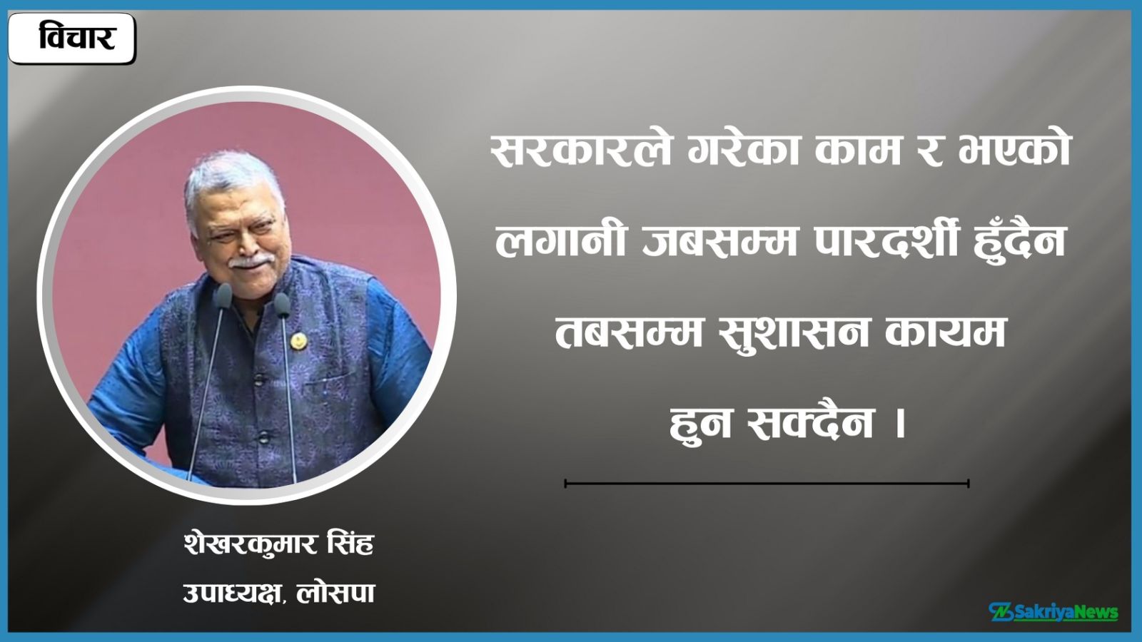लोकतान्त्रिक समाजवादी पार्टी नेपालका उपाध्यक्ष शेखरकुमार सिंहले संविधान संशोधन गरी मधेसी समुदायको अधिकार सुनिश्चित हुने विश्वास व्यक्त गरेका छन् । मधेस प्रदेशबाट राष्ट्रियसभा सदस्य निर्वाचित उनी राजनीतिक दलको अबको मुद्दा देशको आर्थिक विकास हुनुपर्नेमा जोड दिन्छन् । प्रस्तुत छ- उनीसँग राससले गरेको कुराकानीमा आधारित तयार पारिएको सामग्री :