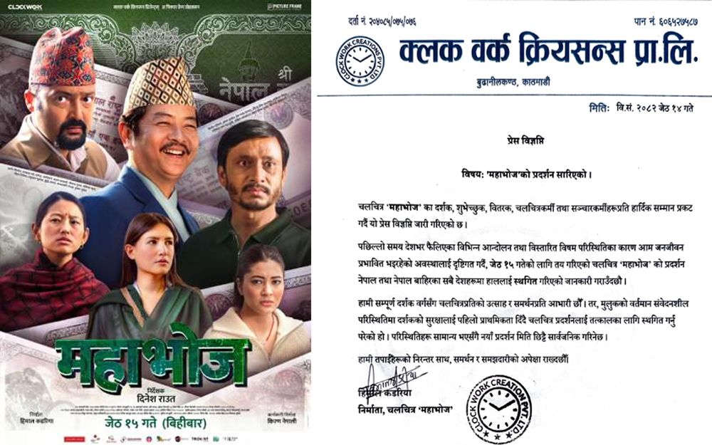 विज्ञप्तिमा भनिएको छ, ‘पछिल्लो समय देशभर फैलिएका विभिन्न आन्दोलन तथा विस्तारित विषम् परिस्थितिका कारण आमजनजीवन प्रभावित भइरहेको अवस्थालाई दृष्टिगत गर्दै, चलचित्र महाभोजको प्रदर्शन नेपाल तथा नेपालबाहिरका सबै देशमा हाललाई स्थगित गरिएको जानकारी गराउँदछौँ ।’