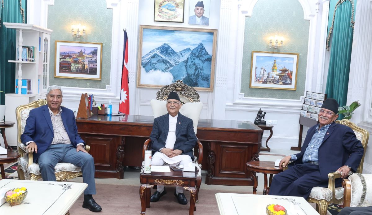 प्रधानमन्त्री तथा नेकपा (एमाले) अध्यक्ष केपी शर्मा ओली, नेपाली कांग्रेसका सभापति शेरबहादुर देउवा र नेकपा (माओवादी केन्द्र) का अध्यक्ष पुष्पकमल दाहाल ‘प्रचण्ड’बीच अप्रधानमन्त्री तथा मन्त्रिपरिषद् कार्यालयमा छलफल भइरहेको हो।