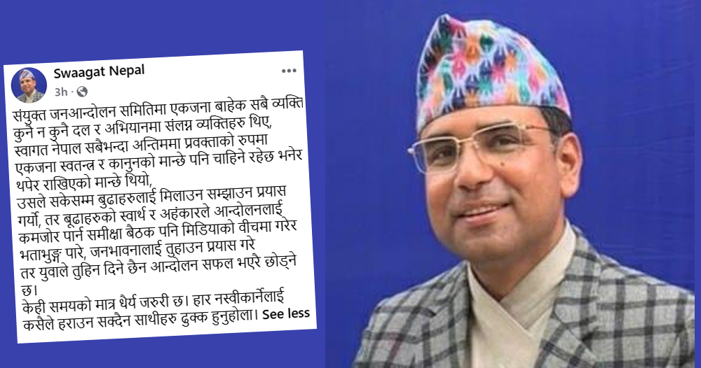 ‘एकजनाबाहेक सबै व्यक्ति कुनै न कुनै दल र अभियानमा संलग्न व्यक्तिहरू थिए । स्वागत नेपाल सबैभन्दा अन्तिममा प्रवक्ताका रूपमा एकजना स्वतन्त्र र कानुनको मान्छे पनि चाहिने रहेछ भनेर थपेर राखिएको मान्छे थियो,’ सामाजिक सञ्जालमा नेपालले लेखेका छन्, ‘उसले सकेसम्म बुढाहरूलाई मिलाउन सम्झाउन प्रयास गर्यो । तर बुढाहरूको स्वार्थ र अहंकारले आन्दोलनलाई कमजोर पार्न समीक्षा बैठक पनि मिडियाको बीचमा गरेर भताभुंग पारे, जनभावनालाई तुहाउन प्रयास गरे । तर युवाले तुहिन दिने छैन । आन्दोलन सफल भएरै छोड्ने छ । केही समयको मात्र धैर्य जरुरी छ । हार नस्वीकार्नेलाई कसैले हराउन सक्दैन साथीहरू ढुक्क हुनुहोला ।’