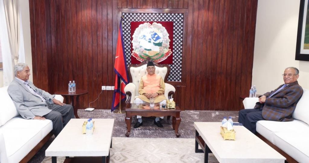 प्रधानमन्त्री तथा मन्त्रिरिषद् कार्यालय सिंहदरबारमा आज दिउँसो ३ बजे बस्ने बैठकमा प्रधानमन्त्री एवं नेपाल कम्युनिष्ट पार्टी (एमाले)का अध्यक्ष ओली, नेपाली कांग्रेसका सभापति शेरबहादुर देउवा, नेपाल कम्युनिष्ट पार्टी (माओवादी केन्द्र)का अध्यक्ष पुष्पकमल दाहाल ‘प्रचण्ड’ सहभागी हुने प्रधानमन्त्रीका स्वकीय अधिकृत उदय पोखरेलले जानकारी दिए ।