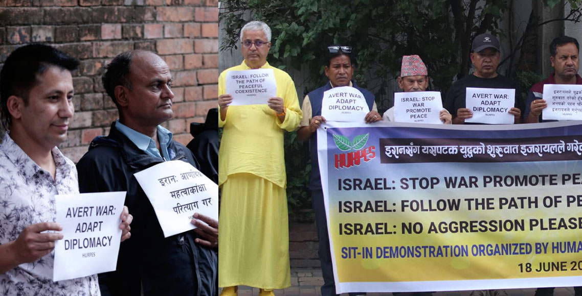 इजरायल र इरानबीच जारी युद्ध तत्काल अन्त्य हुनुपर्ने माग गर्दै मानवअधिकार तथा शान्ति समाजले बुधबार काठमाडौँमा प्रदर्शन गरेको छ। इजरायलको दूतावास र इरानको वाणिज्य दूतावास अगाडि शान्तिको सन्देशसहित समाजले प्रदर्शन गरेको हो।