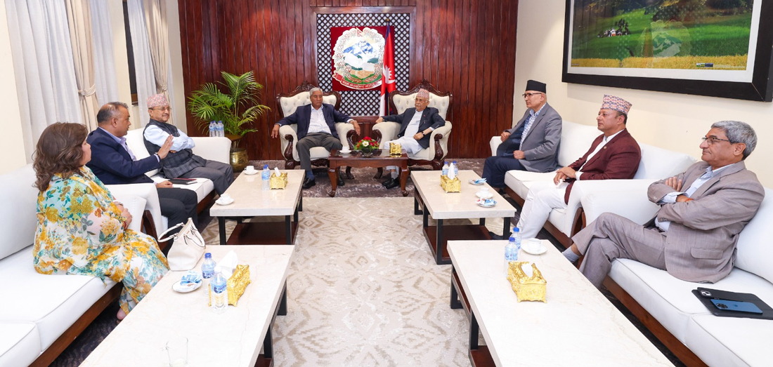 बालुवाटारमा सत्ता साझेदार प्रमुख दुई दलका शीर्ष नेताहरु । तस्बिर : आशिष पौडेल/ प्रधानमन्त्रीको सचिवालय