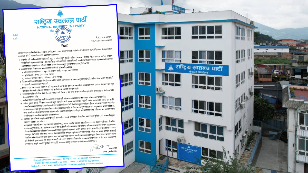 राष्ट्रिय स्वतन्त्र पार्टीको मिति २०८२ असार ४ गते (ने.सं. ११४५ तछलागा सप्तमी) बसेको पार्टी सचिवालय बैठकले देहायका निर्णयहरु गरेको सम्बन्धित सबैको जानकारीका लागि प्रकाशित गरिएको छ ।