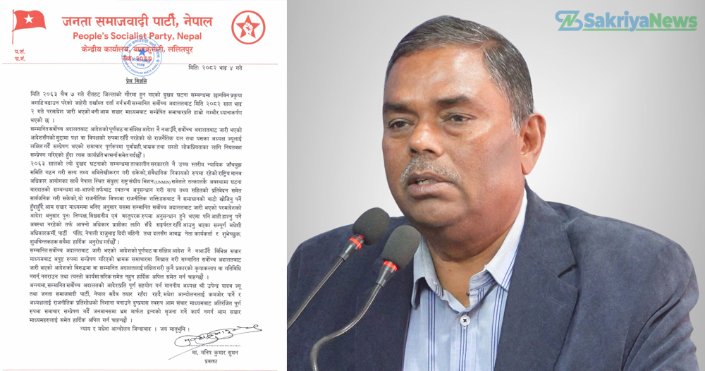यसप्रति आफ्नो गम्भीर ध्यानाकर्षण भएको जनाउँदै जसपाका प्रवक्ता मनीषकुमार सुमनले बुधबार विज्ञप्ति जारी गरी आदेश वा अदालतविरुद्ध कुनै क्रियाकलाप वा गतिविधि नगर्न/नगराउन आफ्ना नेता-कार्यकर्तालाई आग्रह गरेको हो ।