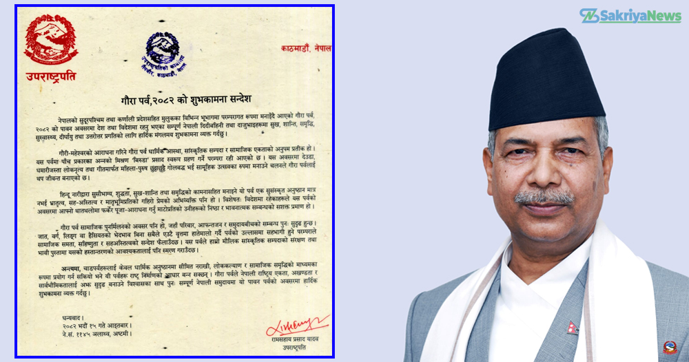उपराष्ट्रपति रामसहायप्रसाद यादवले गौरापर्व सामाजिक पुनर्मिलनको अवसर भएको बताएका छन् । गौरापर्व २०८२ का अवसरमा शुभकामना व्यक्त गर्दै उपराष्ट्रपति यादवले गौरापर्वले परिवार, आफन्तजन र समुदायबीचको सम्बन्ध पुनः सुदृढ बनाउने विश्वास व्यक्त गरे । गौरी-महेश्वरको आराधना गरिने गौरापर्व धार्मिक आस्था, सांस्कृतिक सम्पदा र सामाजिक एकताको अनुपम प्रतीक हो ।