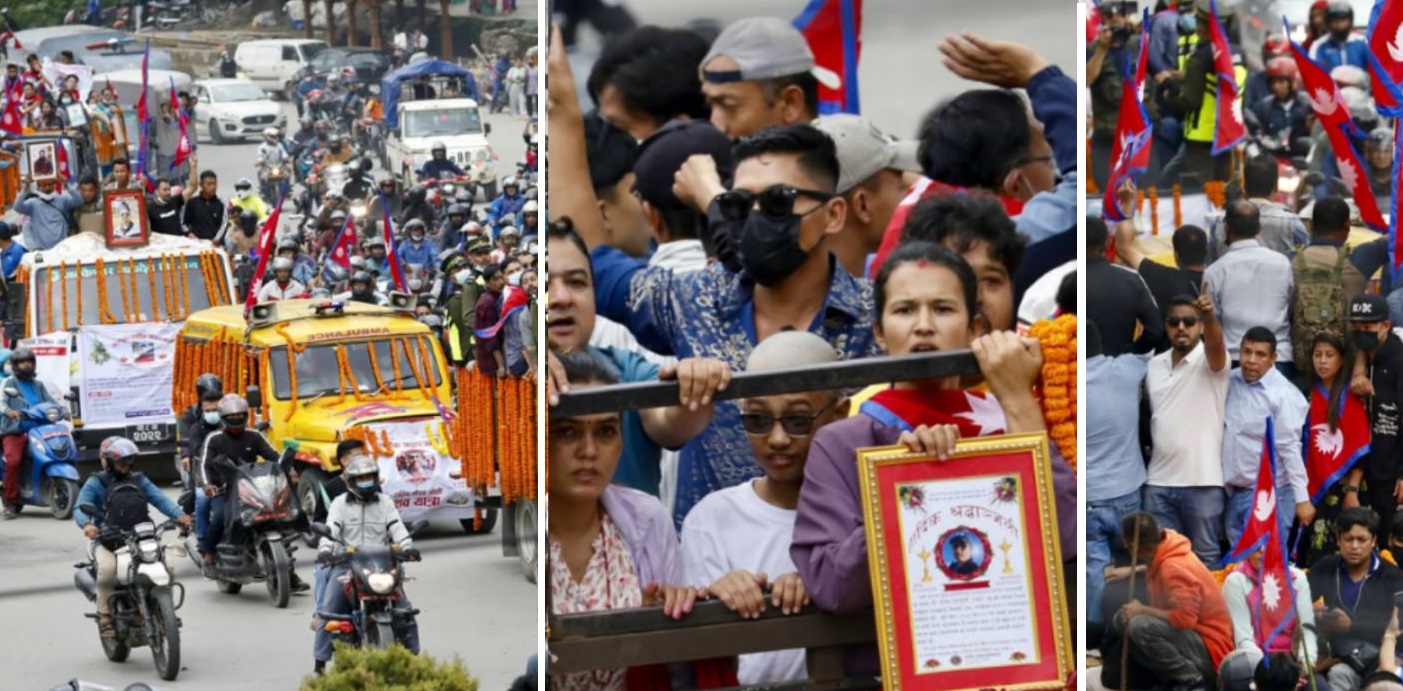 त्रिवि शिक्षण अस्पतालबाट सुरु भएको शवयात्रा चक्रपथ हुँदै पशुपति आर्यघाटतर्फ अग्रसर छ। मृतकका परिवार, आफन्तजन तथा सयौं सर्वसाधारणले शवयात्रामा सहभागी भई तस्बिर, राष्ट्रिय झण्डा र विरोधका सन्देशसहित श्रद्धाञ्जली व्यक्त गरिरहेका छन्।