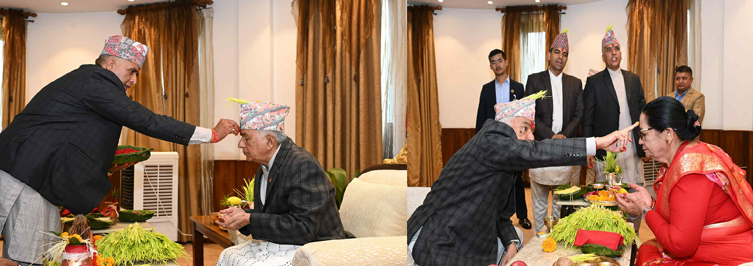 उनले हनुमान ढोका दरवारका गुरु देवराज आर्याल तथा राष्ट्रपतिका पुरोहित अर्जुनप्रसाद न्यौपानेबाट टिका र जमरा ग्रहण गरेका हुन् । आफूले टीका ग्रहण गरेपछि राष्ट्रपति पौडेलले प्रथम महिलासहित परिवारका सदस्यलाई टीका लगाइदिएका थिए ।