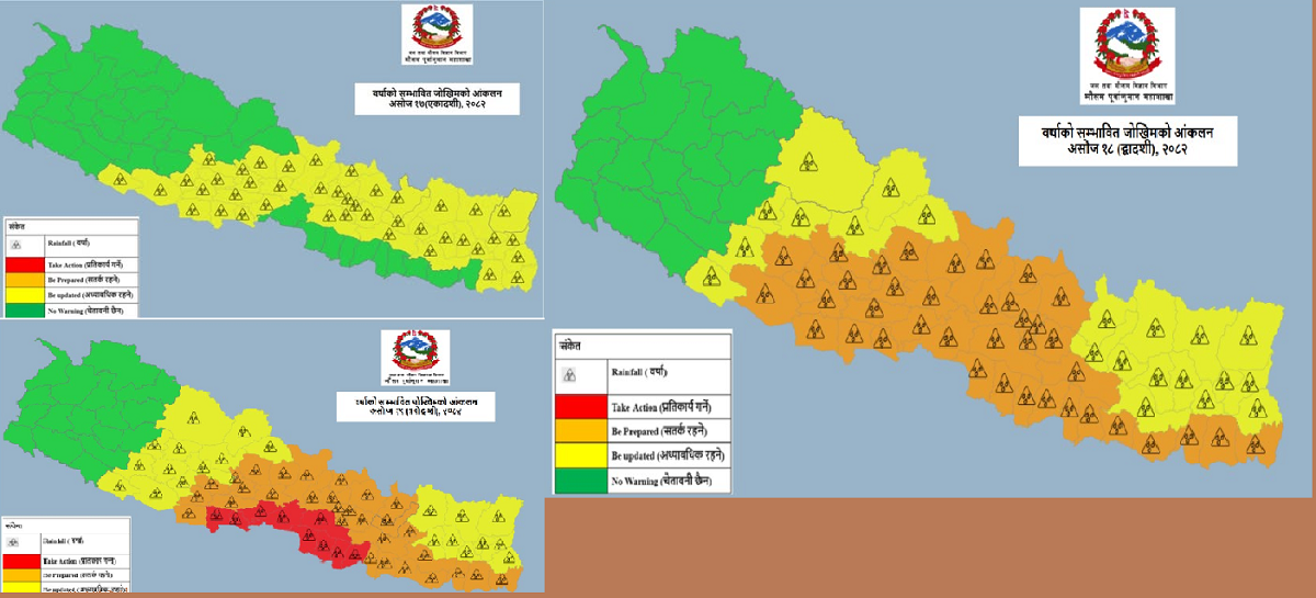 यसैगरी, आज राति देशभर साधारणतया बदली हुनेछ भने कोशी, गण्डकी र लुम्बिनी प्रदेशका पहाडी र तराई भू–भाग र मधेस प्रदेशका केही स्थानमा तथा बाँकी प्रदेशका पहाडी र तराई भू–भागका थोरै स्थानमा मध्यम वर्षाको सम्भावना रहेको छ । कोशी, मधेस, बाग्मती, लुम्बिनी र गण्डकी प्रदेशको एक–दुई स्थानमा भारी वर्षाको सम्भावना रहेकाले आवश्यक सतर्कता अपनाउन आग्रह गरिएको छ ।