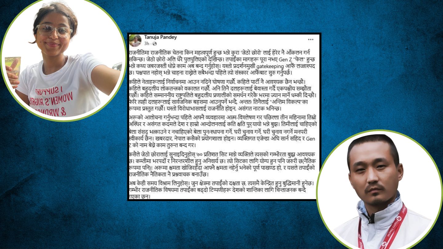 पाण्डेले गुरुङलाई व्यक्तिगत र जेनजीको नाम बेचेर राजनीतिक एजेन्डा अघि नबढाउन आग्रह गर्दै सामाजिक र राजनीतिक जिम्मेवारीको ख्याल गर्न समेत चेतावनी दिएकी छन्।