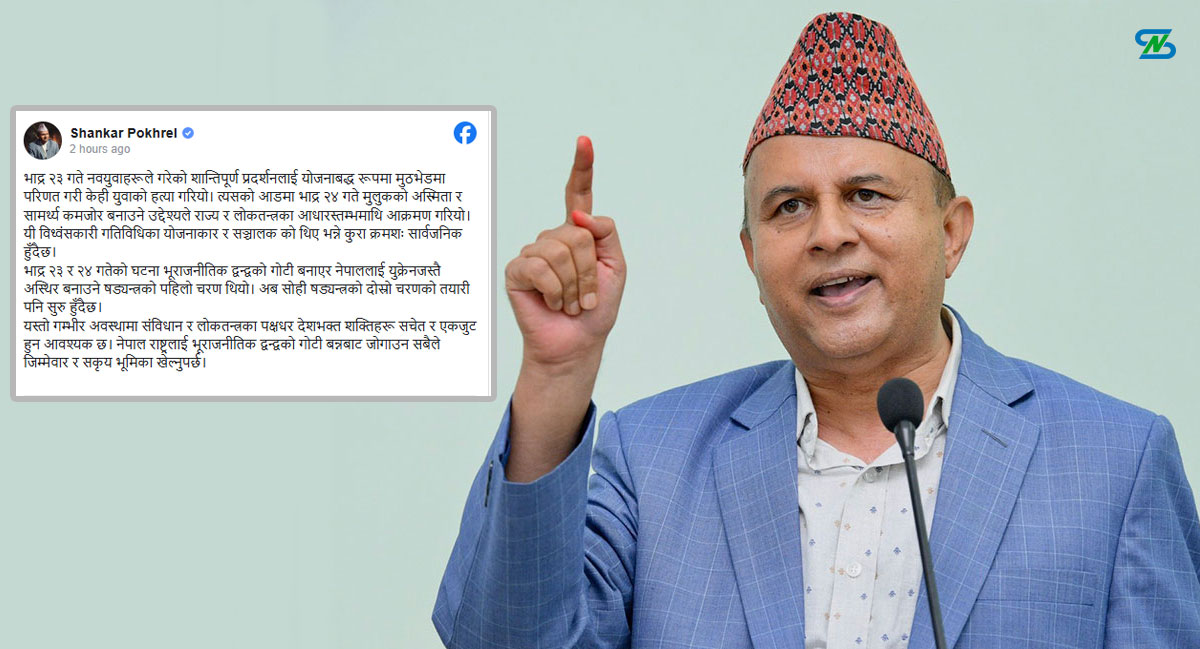 सोही क्रममा एमाले महासचिव शंकर पोखरेलले सामाजिक सञ्जालमार्फत ‘भदौ २३ र २४ गतेका विध्वंसकारी गतिविधिका योजनाकार र सञ्चालक क्रमशः सार्वजनिक हुँदै गएको’ र ‘षड्यन्त्रको दोस्रो चरण सुरु हुँदै गरेको’ दाबी गरेका छन्।