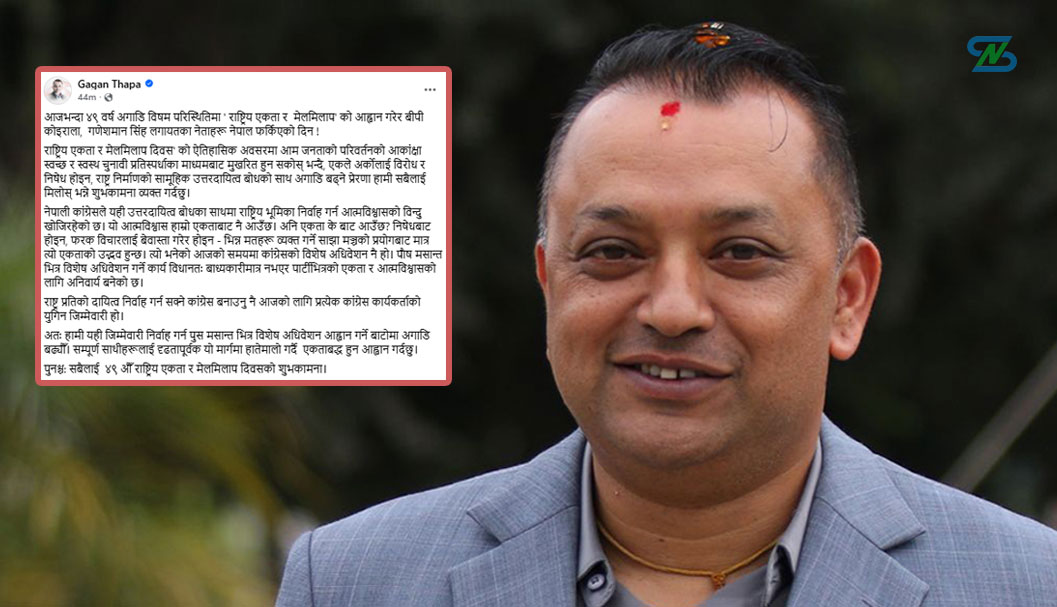 मेलमिलाप दिवसको शुभकामना दिँदै उनले सम्पूर्ण कांग्रेस कार्यकर्तालाई एकताबद्ध भएर विशेष महाधिवेशनको लागि हातेमालो गर्न आह्वान गरेका छन्। राष्ट्रप्रति दायित्व निर्वाह गर्न सक्ने कांग्रेस बनाउनु आजको जिम्मेवारी भएको बताउँदै थापाले यही जिम्मेवारी निर्वाह गर्न पुस मसान्त भित्र विशेष अधिवेशन आह्वान गर्ने बाटोमा अगाडि बढेको बताए ।तोकिएको मितिमा नियमित महाधिवेशन नहुने परिस्थिति बन्दै गएपछि थापाले विशेष महाधिवेशनमा जोड दिएका हुन् ।