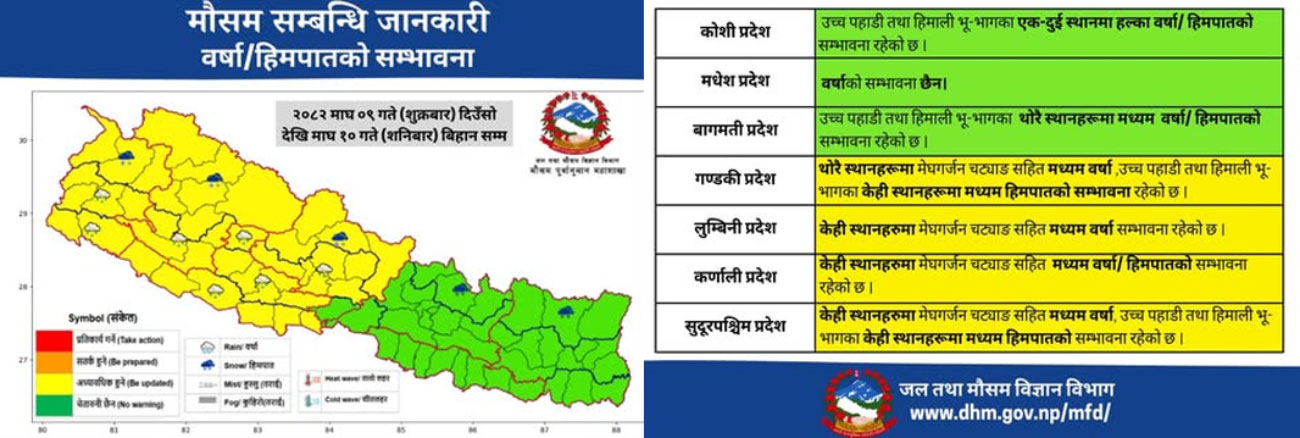 वरिष्ठ मौसमविद् डेविट ढकालले वर्षा शनिबार बेलुकासम्म मात्रै रहने बताए। तर माघ १३ गते रातिदेखि फेरि हल्का वर्ष र उच्च हिमाली भूभागमा हिमपातको सम्भावना रहेको वरिष्ठ मौसमविद् ढकालले बताए।