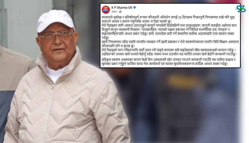 पूर्वप्रधानमन्त्री एवं एमाले अध्यक्ष केपी शर्मा ओलीले मुद्दा चलाउने आधार र प्रमाण नपुगेपछि आफू रिहा भएको प्रतिक्रिया जनाएका छन् । प्रतिकूल स्वास्थ्य अवस्थाका कारण केही दिन अस्पतालमै रहेर उपचार गराउने पनि ओलीले जानकारी गराएका छन् ।