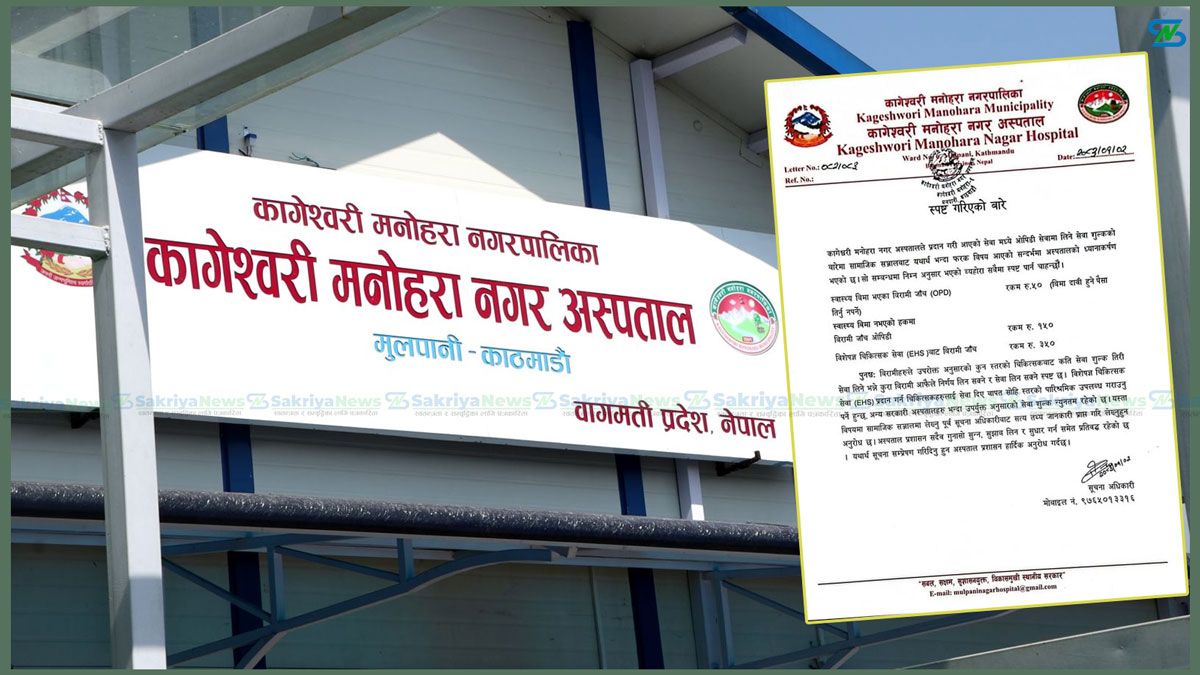 कागेश्वरी मनोहरा नगर अस्पतालले ओपीडी (बहिरंग सेवा) शुल्क सम्बन्धमा सामाजिक सञ्जालमा यथार्थभन्दा फरक सूचना फैलिएको भन्दै ध्यानाकर्षण भएको जनाएको छ। साथै, अस्पताल प्रशासनले आज एक सूचना जारी गर्दै सेवाशुल्कबारे स्पष्ट पारेको छ।
