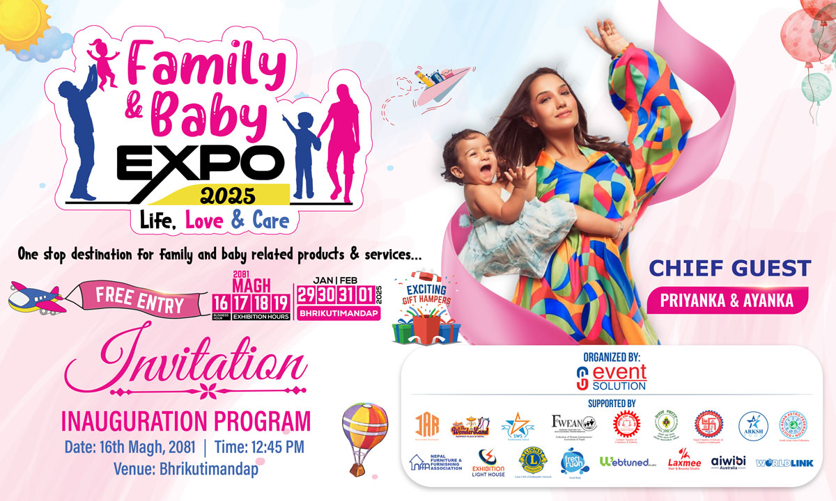 माघ १६ गतेदेखि इभेन्ट सोलुसन प्रालिको आयोजनामा राजधानीको भृकुटीमण्डपमा ‘फेमिली एन्ड बेबी एक्स्पो २०२५’ आयोजना हुन लागेको हो ।