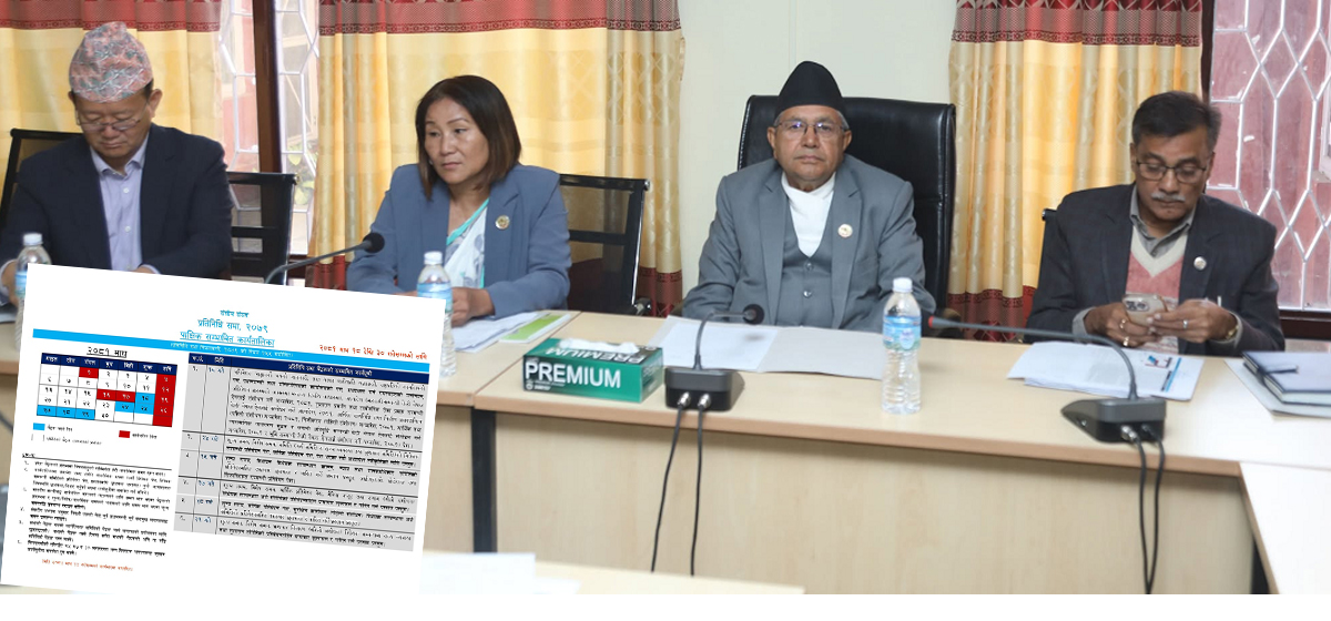 संसद सचिवालयको क्यालेन्डर अनुसार माघ २२,२३,२४,२८,२९ र ३० बैठक राखिएको छ । २५, २६ र २७ गते भने विभिन्न समितिको बैठक राखिएको छ ।सरकारको सिफारिसमा राष्ट्रपति रामचन्द्र पौडेलले माघ १८ गतेका लागि संसदको बैठक आह्वान गरेका छन् ।