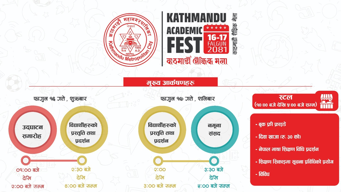 काठमाडौँ महानगरपालिकाले यही फागुन १६ र १७ गते प्रदर्शनी मार्गस्थित राष्ट्रियसभागृहमा ‘काठमाडौँ शैक्षिक मेला’ आयोजना गर्ने भएको छ । महानगरपालिकाद्वारा थालिएका कार्यक्रमबाट विद्यार्थीमा परेको प्रभाव, यसबाट उनीहरूले सिकेका ज्ञान र सीपहरूको प्रस्तुति तथा प्रदर्शनीका लागि मेला आयोजना गर्न लागिएको हो ।