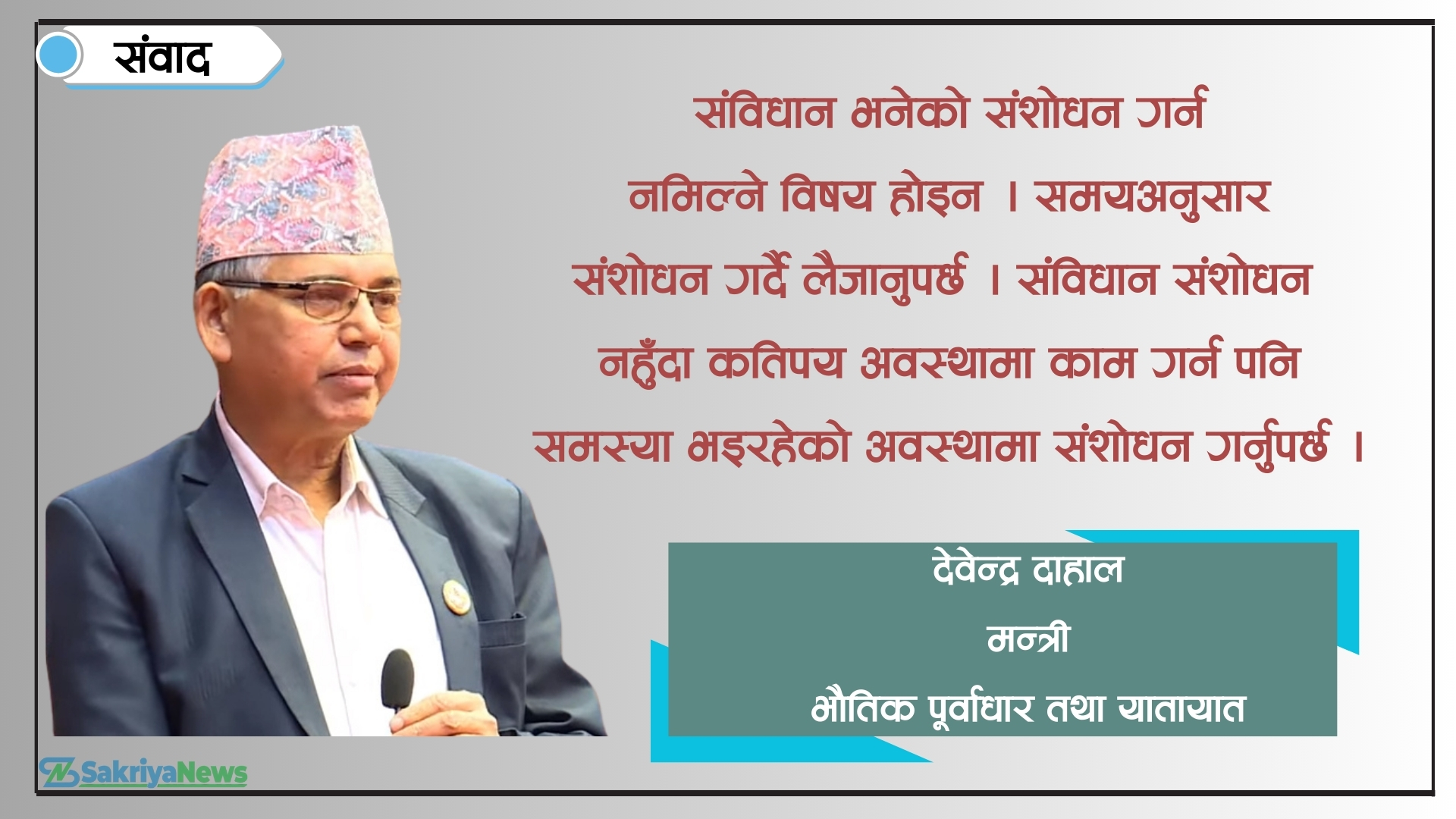 भौतिक पूर्वाधार तथा यातायातमन्त्री देवेन्द्र दाहाल राष्ट्रियसभा सदस्य पनि हुन् । २०१५ भदौ १६ गते ताप्लेजुङमा जन्मिएका दाहाल हाल दमक नगरपालिका ५ को स्थायी बसोबासी हुन् । नेकपा एमालेबाट मन्त्री बनेका दाहाल पार्टीको पोलिटब्युरो सदस्य हुन् । उनले पञ्चायती व्यवस्थाविरुद्ध २०३६ सालमा सुरु भएको विद्यार्थी आन्दोलनबाट राजनीतिक यात्रा सुरु गरेका थिए । लामो समय झापाको राजनीतिमा रहेर विभिन्न तहको जिम्मेवारी पूरा गरेका मन्त्री दाहाल सङ्गठन सञ्चालन काम गर्ने क्रममा २०४५ सालदेखि तत्कालीन नेकपा एमालेको झापा जिल्ला कमिटीमा आबद्ध भएका थिए । उनी २०७६ मा भएको राष्ट्रियसभाको निर्वाचनबाट सदस्य पदमा निर्वाचित भएका थिए । प्रस्तुत छ- मन्त्री देवेन्द्र दाहालसँग सांसद हुँदाको अनुभव, सङ्घीय संसद्का गतिविधि, सरकारले गरेका गतिविधि, संविधान संशोधन, संविधान कार्यान्वयन र मुलुकको समसामयिक विषयमा राससले गरेको कुराकानी :
