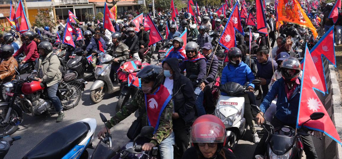 राष्ट्रिय प्रजातन्त्र पार्टी (राप्रपा)ले काठमाडौँमा प्रदर्शन गरेको छ। राष्ट्रिय झण्डासहित राप्रपाले बुधबार मोटरसाइकल र्याली निकालेको हो ।