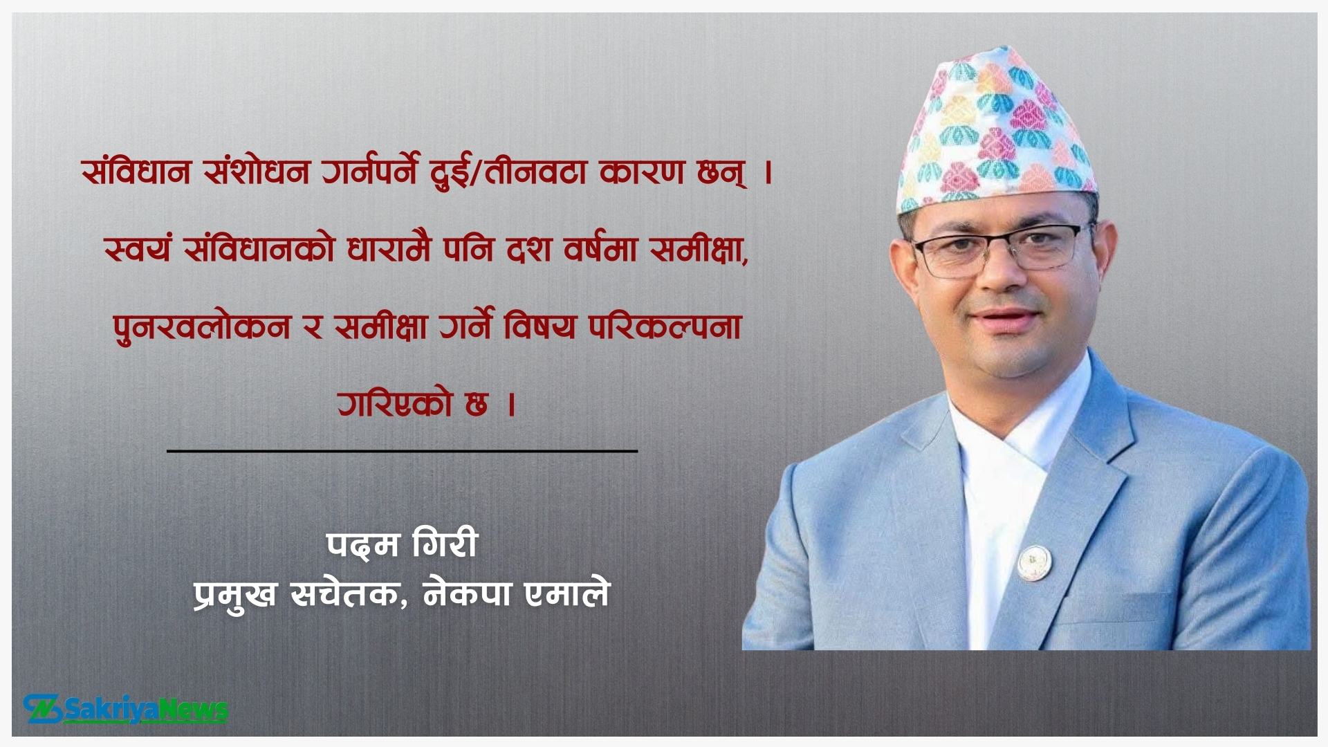 संविधान संशोधन गर्नपर्ने दुईतीन वटा कारण छन् । स्वयम् संविधानको धारामै पनि दश वर्षमा समीक्षा, पुनरवलोकन र समीक्षा गर्ने विषय परिकल्पना गरिएको छ । अहिले नयाँ विषय अघि सारिएको होइन । मुलुकमा राजनीतिक अस्थिरता हुँदा सुशासन र विकास प्रभावित भएको पक्षलाई मध्यनजर गर्दै स्थायित्व कायम गर्नका निम्ति पनि संशोधन गर्न खोजिएको हो । कतिपय संवैधानिक अङ्गका मौजूदा व्यवस्थालाई चुस्त र व्यवहारिक बनाउन आवश्यक छ । जनताका पक्षमा कार्यान्वयनमा लैजान संविधान संशोधनका विषय उठेका हुन् । समावेशी, सहभागितामूलक र समानुपातिक चरित्रलाई थप सुनिश्चित गर्दै संविधानलाई समयानुकूल तुल्याउन संशोधन आवश्यक हुनसक्छ । त्यसै वरिपरि रहेर संशोधनका विषयमा संवाद चलेका हुन् । उपयुक्त समयमा आवश्यक विषय बाहिर आउला । केही नेता र दल विशेषको नभई आमजनताका सरोकार रहेकाले छलफल र संवादका आधारमा उपयुक्त ढङ्गबाट संशोधनलाई अघि बढाउन सकिन्छ । यसमा सबै नागरिकले आफ्ना अभिमत, विचार राख्ने र छलफल गर्दै नागरिकको सहभागिता जुटाउने काम गर्नुपर्छ ।