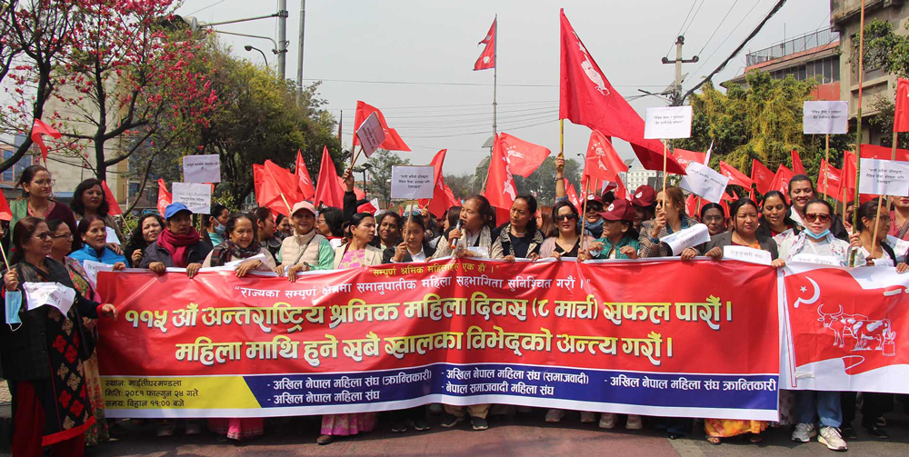 काठमाडौंमा शनिबार विभिन्न ५ राजनीतिक दलनिकट महिला संगठनहरुले ११५औं अन्तर्राष्ट्रिय श्रमिक महिला दिवसका अवसरमा अध्यादेशमार्फत निरङ्कुशता नलाद्नसमेत चेतावनी दिएका छन् ।